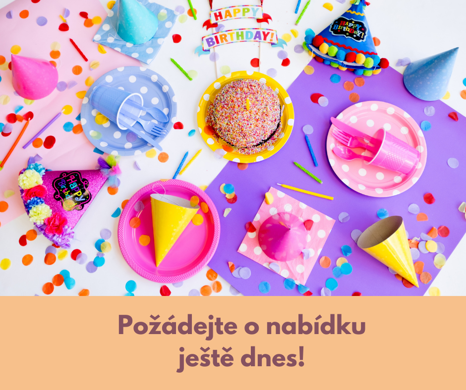 - narozeninové nádobí a lehké občerstvení (kelímky, ubrousky, talířky, balonky, jablečný džus, křupky atd.)